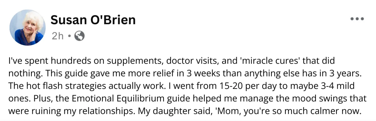 Your hot flashes and night sweats will dramatically decrease in frequency and intensity. No more constant flushing, no more drenching your sheets. You'll finally feel comfortable in your own skin again.