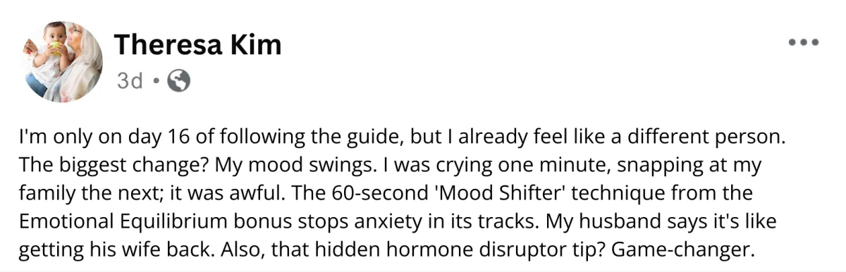 You'll stop feeling like your body is out of control. This is how I felt when I was struggling with perimenopausal mood swings… But with this guide, you'll have the tools to balance your emotions, and you'll feel confident and in control again.